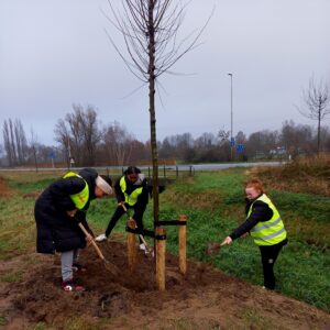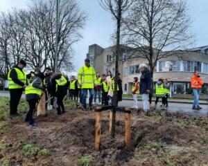 Zoals gepland aan de Piet Heinstraat: de ontvangst van de kinderen en verdere gasten vond plaats op een mooi ruim grasveld voor het gebouw waar Oekraïense vluchtelingen gehuisvest zijn. De vlaggen strak in het gelid en de tafels waar koek en chocolademelk op zouden worden gepresenteerd veilig voor de regen onder het afdak van de partytent. Het was die ochtend niet koud, wel grijs en druilerig. Een mooie mengelmoes van 20 kinderen van de groepen 6 , 7 en 8 van basisschool De Flief lieten zich er niet van weerhouden om in optocht, in kleurrijke boomfeestdagveiligheidshesjes gestoken en vrolijk gestemd, ten tonele te verschijnen.