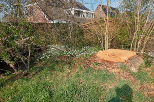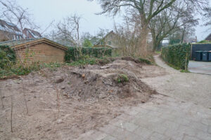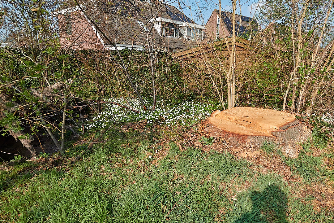 Bioloog Van Hoffen loopt iets verder achter de tuinen van het wijkje in Vorden en wijst naar een paar enorme boomstronken die daar liggen. Gemeenteambtenaren van de plantsoenendienst hebben die uitgegraven, niet wetende dat dit oude bosgrond was. “Toen ik dat zag heb ik meteen verontwaardigd aan de bel getrokken”, vertelt hij. “Ze wisten niet dat het om een stukje oud bos ging, in het bestemmingsplan is het gewoon ingetekend als groengebied. Met het uit de bodem halen van de stronken hebben ze de grond er eromheen ook uitgegraven. Met als gevolg dat bijzondere planten als bosanemoon, wilde kers, vlier en grote muur nu ook zijn verdwenen. Doodzonde! We gaan ons nu beraden wat we kunnen doen om het te herstellen.”
