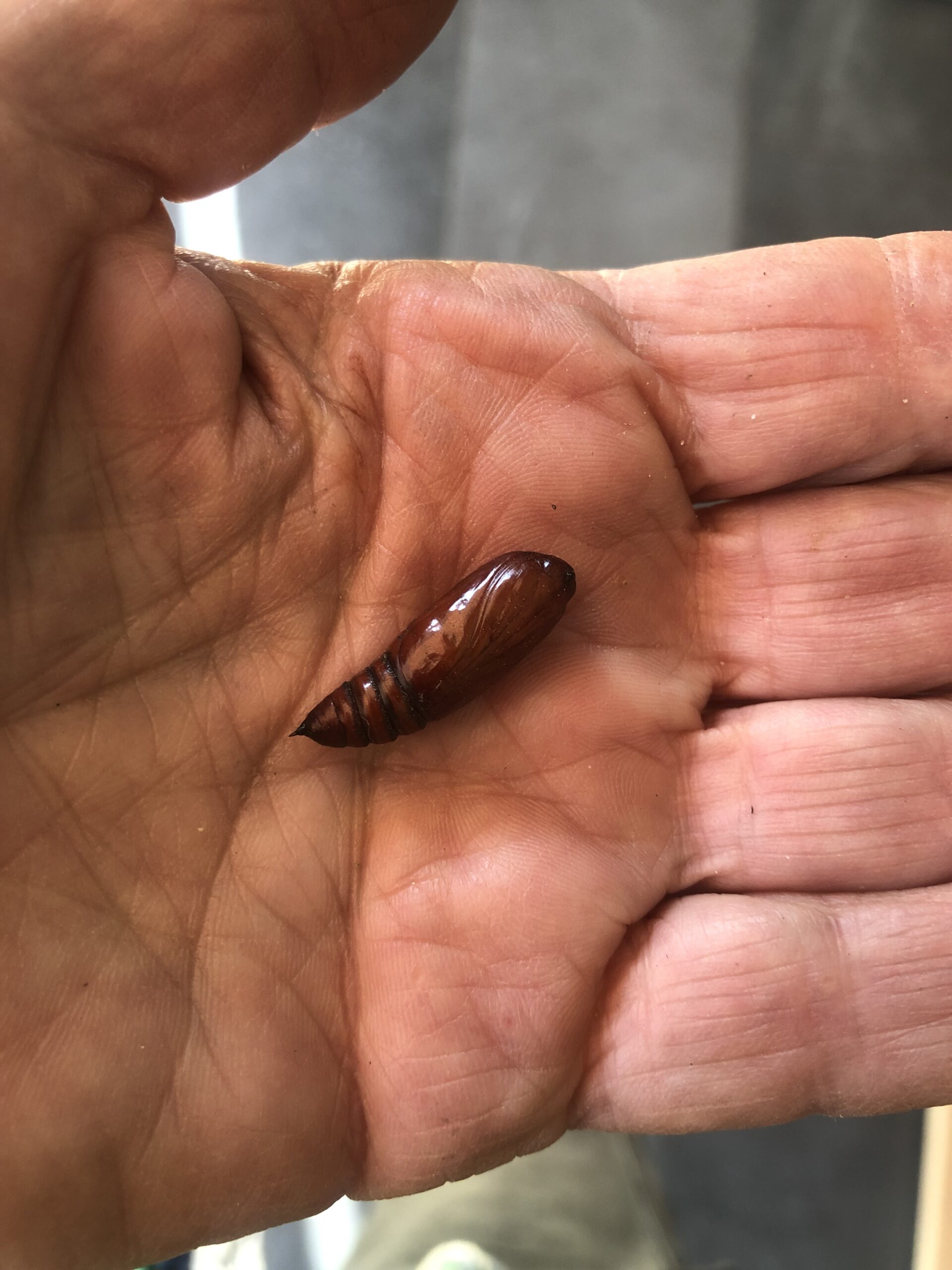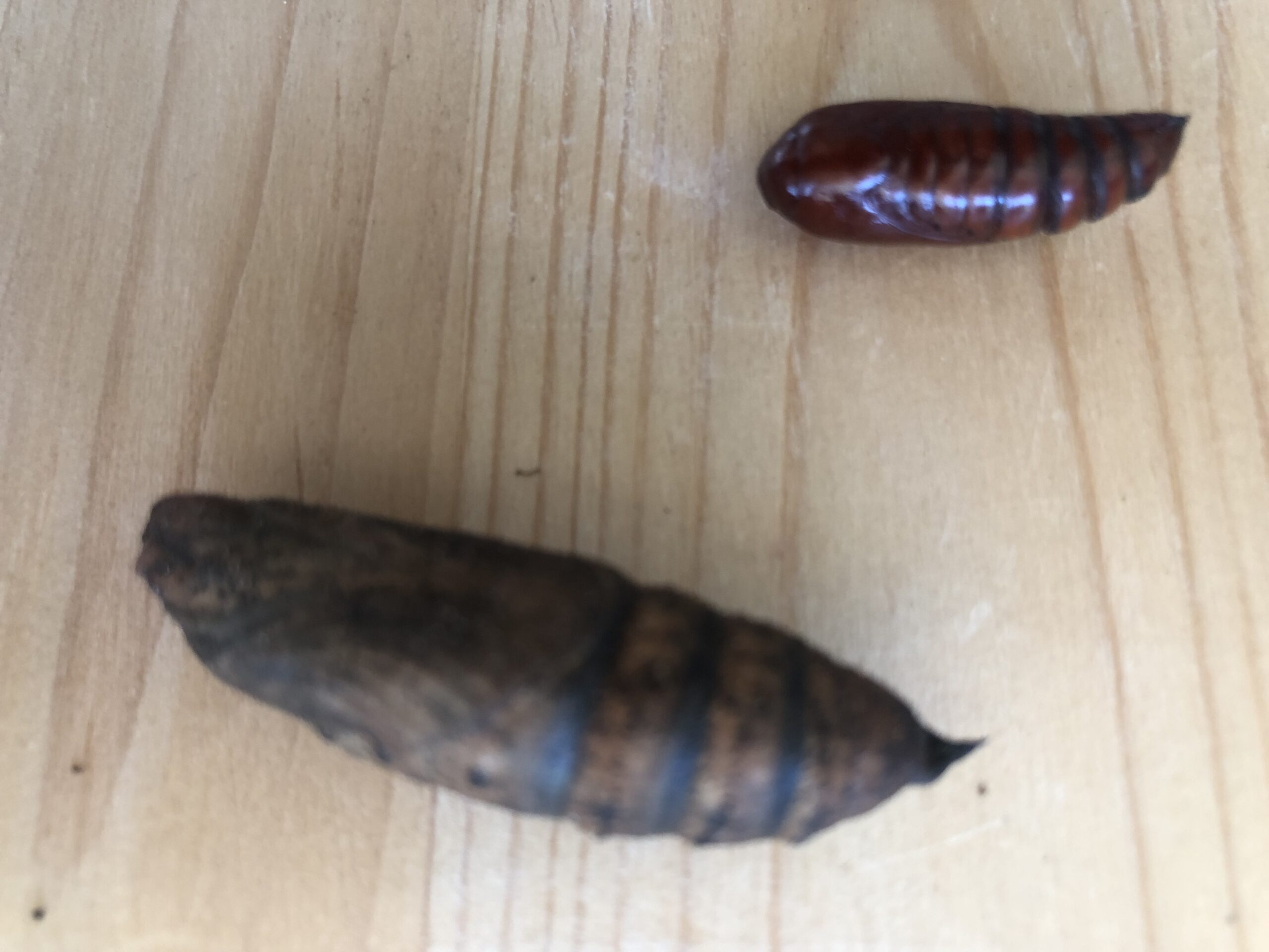 ze heeft een mooie pop van een nachtvlinder gevonden in de tuin. Daarnaast heeft ze een grote pop van de windepijlstaart gevonden.