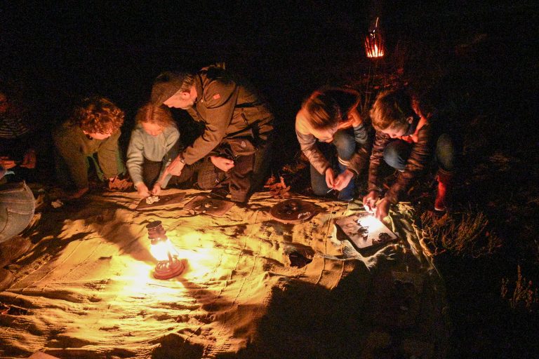 We ontmoeten bij het vuur het verhalenvrouwtje. Ze vertelt over de stadsmuis die zo graag een nieuw holletje op een donker plekje wil hebben. Met haar vriendin de veldmuis gaat ze op zoek en na diverse ontmoetingen vindt ze een prachtig plekje in het donkere bos. Wat fijn is dat. Dan lopen we verder en zien we weer een vuur. Dichterbij gekomen blijken we hier zelf vuur te mogen maken. Met een ‘moderne tondeldoos’ blijken alle kinderen in staat echt levend vuur te maken. Hoe mooi is dat licht van echt vuur in de duisternis. Even verder ontmoeten we een ‘tovenaar’ die alles weet van dierengeluiden en uilen, de nachtvogel bij uitstek. We hangen aan zijn lippen en willen niet weg, maar de sterrenhemel lonkt. Verder wandelend vinden we een kleed op een open plek. Daar kunnen we lekker op liggen en genieten van de sterren. Wat zijn ze mooi die flonkerende sterren (of zijn het satelieten of vliegtuigen?) en weer horen we de bosuil! We willen best een dutje blijven doen hier op dit kleed. Maar nee, we doen het zonnespel en tollen als aarde en andere planeten om de zon. Daarna trekken we verder en ontmoeten de mannen van de sterrenwacht met hun grote telescopen. Wat weten zij veel! De poolster, de grote beer, Cassiopeia zijn zichtbaar en zelfs Jupiter laat zich heel even zien.
