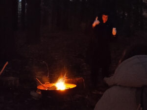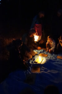 De olielamp was ons baken naar Bella de bosmuis die een kampvuurverhaal vertelde. Daarna je stinkende best doen om met ‘vuurstenen’ een vuurtje te ontsteken, om je vervolgens te verwonderen over het geruststellende nachtgeluid en de superzachte veren van de bosuil. Dan even liggen op de heide om de nachtgeluiden te beleven en tot slot door twee enorme telescopen van de mannen van de sterrenwacht Lochem te kijken naar Saturnus met zijn magische ringen.