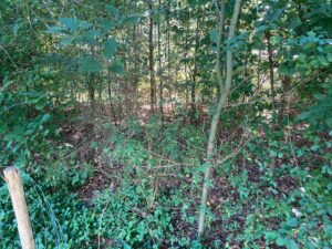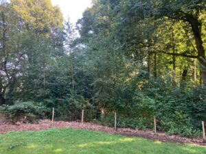 Eind 2020 zag ik een oproep tot het aanleggen van een Tiny Forest (TF) m.b.v. het IVN. Het meest kenmerkend aan een TF is dat de grond tot een meter diep wordt afgegraven en ook bemest wordt en dat er 3 bomen/heesters per vierkante meter geplant worden. Dat leek ons een ontzettend leuk idee en we zijn vol enthousiasme aan de slag gegaan. Omdat het al laat in het seizoen was hebben we bij verschillende kwekerijen de planten bij elkaar moeten scharrelen, maar het merendeel betrof bosplantsoen van ca 100 cm hoog.
