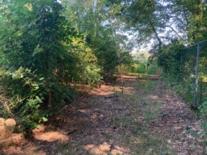 De omheining is gedeeltelijk verplaatst omdat we besloten hebben de 4 meter brede strook tussen het TF en het aan de oostkant van het perceel gelegen bos min of meer erbij te trekken en hetzelfde geldt voor strook aan de noordkant die grenst aan een wandelpad.