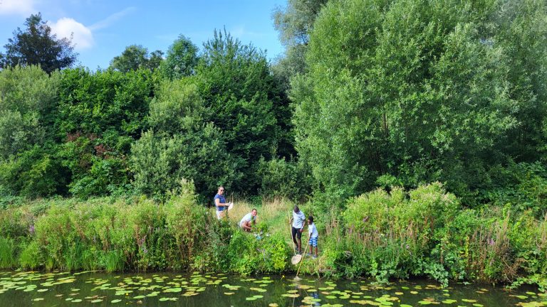 De schepnetten, bakjes en zoekkaarten lagen nog maar net klaar of de eerste gezinnen doken er al op: ‘ja, wij willen waterdiertjes vangen’, en vanaf dat moment waren we (Hetty, Vincent, Helga en ik) met zijn allen van 11 tot half 5 in de weer met (groot-)ouders en kinderen, druk bezig met een geschikte plek langs de dichtbegroeide oever van de laak te vinden om de schepnetten uit te werpen.