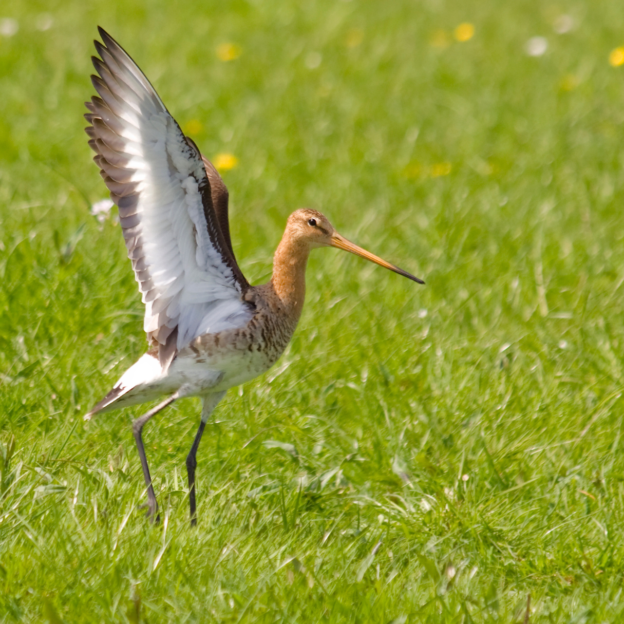 De mannelijke grutto klimt in de lucht in en laat bij een kantelende vlucht zijn roep overduidelijk horen. Bij het landen laat hij zijn witte ondervleugels zien.