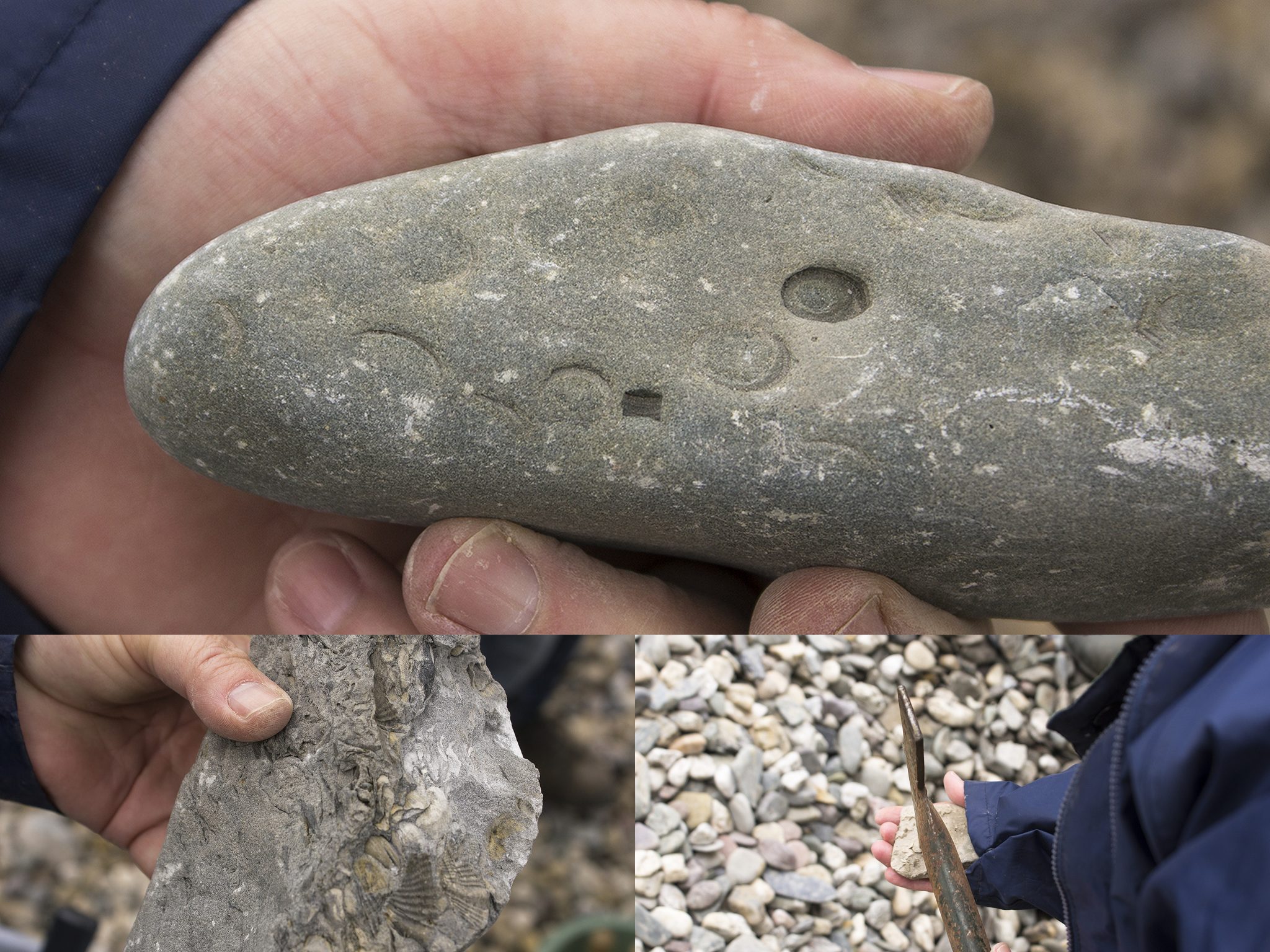 Neem altijd een plastic zakje met een nat doekje mee. In natte oppervlakten zijn fossielen veel beter zichtbaar. Kijk maar! Geen doekje? Een beetje spuug doet ook wonderen.