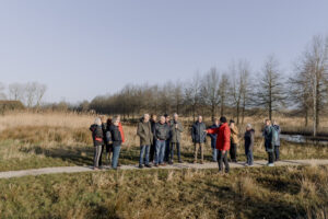 Verder gaan we. Het is winter, dus is het relatief kaal, zegt Jellema, alsof hij zich verontschuldigt. ‘Maar we zien altijd iets. Kijk, daar in de verte’, wijst hij naar de vijver, waar je met een beetje focussen plateaus kunt zien liggen op het wateroppervlak. Die zijn daar aangelegd voor de visdiefjes om te nestelen, vertelt Jellema. Fietser!, klinkt het als er een fietser aankomt. De ene roept het naar de andere en zo gaat de waarschuwing de hele groep door en waaiert de hele sliert uit naar links. De moeder met peuter voorop gaat het niet snel genoeg. ‘Hallo, jémig zeg!’, moppert ze terwijl ze geïrriteerd de wandelaars voorbij rijdt. De wandelaars laten nochtans hun goede humeur niet bederven en stappen vrolijk verder. Een van hen is Jelle van Gans. Hij is 84 en wandelt al vijf jaar met de groep. Wat hij er leuk aan vindt? ‘De sociale contacten’, zegt hij meteen. ‘Het gaat niet alleen om het wandelen, maar ook om de gezelligheid.’ Toen zijn vrouw overleed, zocht hij ‘iets’. Hij was altijd al veel in de natuur, hield van buiten zijn, had bovendien altijd veel aan sport gedaan, dus toen hij over de wandelgroepen las, was zijn interesse gewekt. Hij ging een keer mee en de rest is geschiedenis. ‘Ik ben heel blij dat ik erbij ben. Allemaal aardige mensen.’