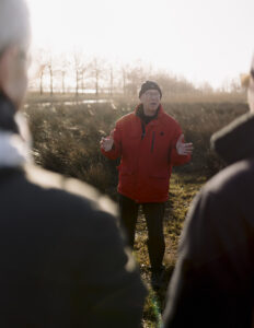 Ondertussen wijst Piet Jellema naar een aalscholver in de verte. ‘Wat is die aan het doen?’, vraagt hij aan Dora Busser, die voor hem loopt in fleurige kleding. ‘Hij is zich aan het drogen’, repliceert die. ‘En waarom? Wat missen ze?’ Ook daar heeft ze antwoord op. ‘Een vetlaagje.’ Het klinkt als een overhoring. Heel goed, zegt Jellema: aalscholvers missen het vetlaagje dat eenden wél hebben en dat hun veren drooghoudt, en daarom moeten ze zichzelf laten opdrogen. Busser heeft haar hele leven gewandeld, vertelt ze, en op die manier veel botanische kennis opgedaan. Ze maakte foto’s van planten die ze tegenkwam en zocht vervolgens thuis de namen op. ‘Zo heb ik veel geleerd’, zegt ze. Ze wandelde een keer met haar negentigjarige vader en verbaasde hem door van zowat elk plantje de naam te weten. ‘‘Dat heb je niet van mij’’, zei hij. ‘Nee, dat klopt’, lacht ze. Langs de route laat een lange vrouw in een rode trenchcoat haar hond uit. Ze blijft even staan om de wandelgroep te laten passeren. ‘Wat gezellig zo!’, roept ze. ‘Kom erbij!’, roept een van de wandelaars in het voorbijgaan. ‘Elke donderdag om tien uur verzamelen bij de Chinees!’ ‘Dank, goed om te weten!’, roept de vrouw terug. Kijk, lacht Piet Jellema, zo gemakkelijk kan het gaan.