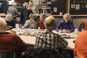 Even later, bij de koffie in het wijkcentrum, gaat er een kaart rond voor een wandelaar die ziek is. Zo zie je maar weer, zegt Meino Dijkstra, nadat hij zijn naam heeft bijgeschreven: er ontstaan ook vriendschappen. Zelf sloot hij zich aan omdat hij iets aan zijn gezondheid wilde doen. ‘Dat mocht ook wel na veertig jaar kantoorwerk’, verduidelijkt hij terwijl hij op een niet aanwezig buikje klopt. Naast haar zit wandelaar Loeky Dobma. Zij heeft wel eens geen zin, geeft ze toe, als het slecht weer is denkt ze wel eens: ik sla een keertje over. ‘Maar dan tegen half tien begint het te kriebelen. Dan ga ik toch en ik ben altijd blij dat ik ben geweest.’