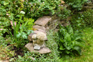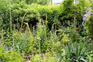 Twee speciekuipen fungeren als vijvertjes en zitten vol met kikkers die wegplonzen als we erlangs lopen. Ook de egel komt geregeld op bezoek in deze weelderige tuin. David knielt in het hoge gras en wijst op lange ereprijs, gewone rolklaver, smalle weegbree en hondsdraf tussen de sprieten. Aan de rand staat dagkoekoeksbloem, herik en bosandoorn. De planten in Davids tuin doen het goed op zandgrond en zijn zoveel mogelijk inheems in Nederland, wat betekent dat ze hier van nature voorkomen. David: ‘Dat zijn soorten die goed zijn voor insecten en bodemleven.’