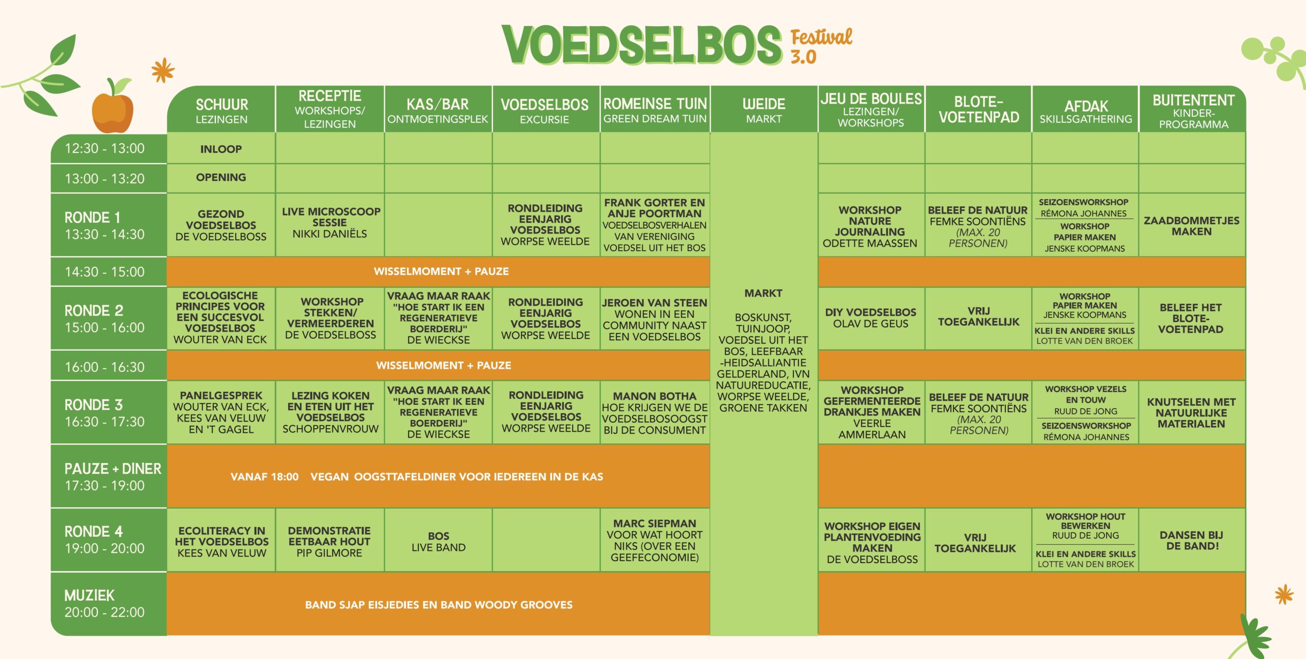 Het Voedselbos Festival 3.0 vindt plaats op zaterdag 4 oktober van 12.30 uur tot 22.00 uur bij Buitenpost (Rijksstraatweg 17A, 7391 MH Twello). Wil je extra lang genieten van Buitenpost? Boek bij je ticket een plekje op de camping en ga slapen en word wakker in de voedselbos sfeer.