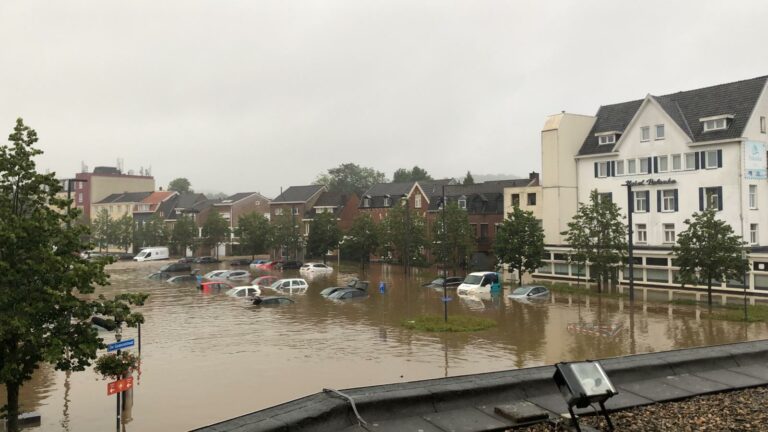 De afbeelding is gemaakt tijdens de hevige overstromingen van de Maas in 2021.