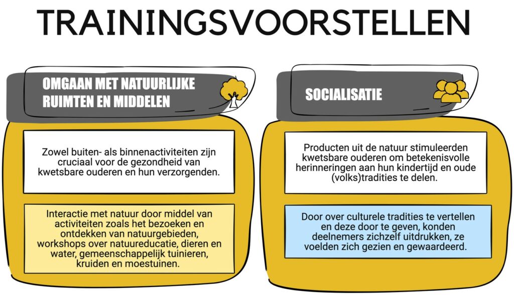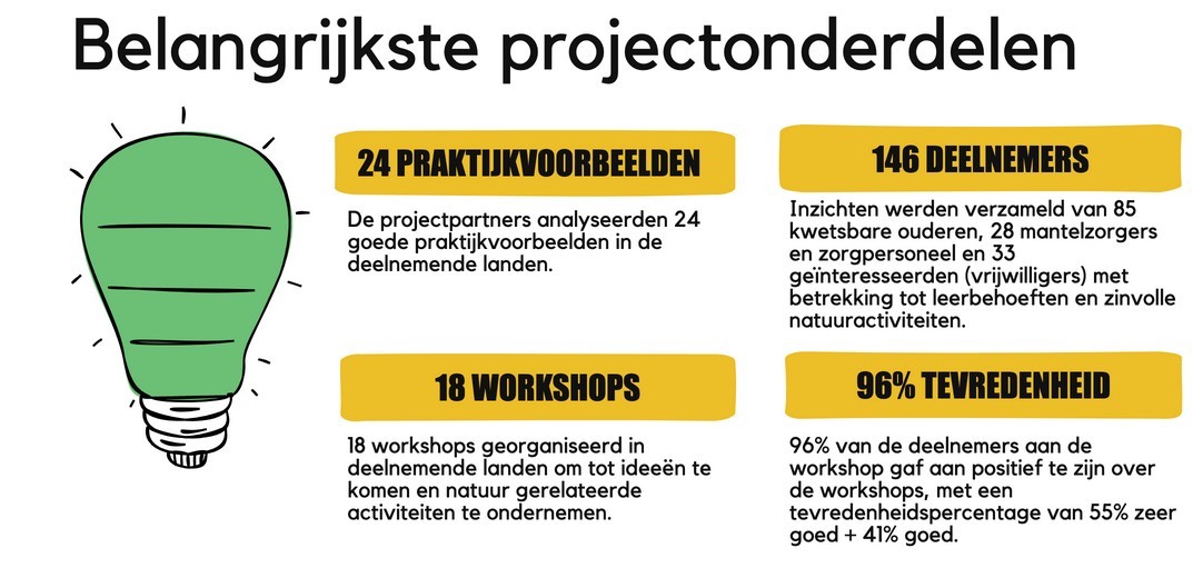 Uit de workshops kwamen inzichten naar voren, zowel over het omgaan met natuurlijke ruimte en middelen als voor socialisatie. Zowel buiten als binnen activiteiten zijn cruciaal voor de gezondheid van kwetsbare ouderen en hun verzorgenden. Op de sociale dimensie kwam sterk naar voren dat natuur een trigger kan zijn om herinneringen uit de kindertijd en culturele volkstradities te delen. Dit gaf de deelnemers een gevoel van waardering, Zij voelde zich gezien.