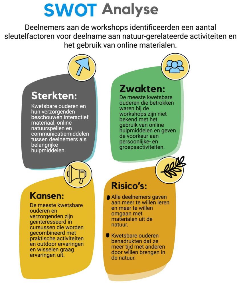 De deelnemers aan de workshops identificeerden een aantal sleutelfactoren voor natuuractiviteiten. Deze tips worden meegenomen in de volgende fase van project Flower. De bevestiging, die als kans naar voren kwam, is dat de meeste kwetsbare ouderen en verzorgenden geïnteresseerd zijn in cursussen gecombineerd met praktische activiteiten. Zij wisselen ook graag ervaringen uit. Voor de oudere doelgroep is deze sociale component erg belangrijk: samen. Dit sluit aan bij inzichten over (hoge) eenzaamheid in deze doelgroep. Online materialen en leren is logischerwijs meer geschikt voor de doelgroep verzorgenden dan voor de kwetsbare ouderen zelf.