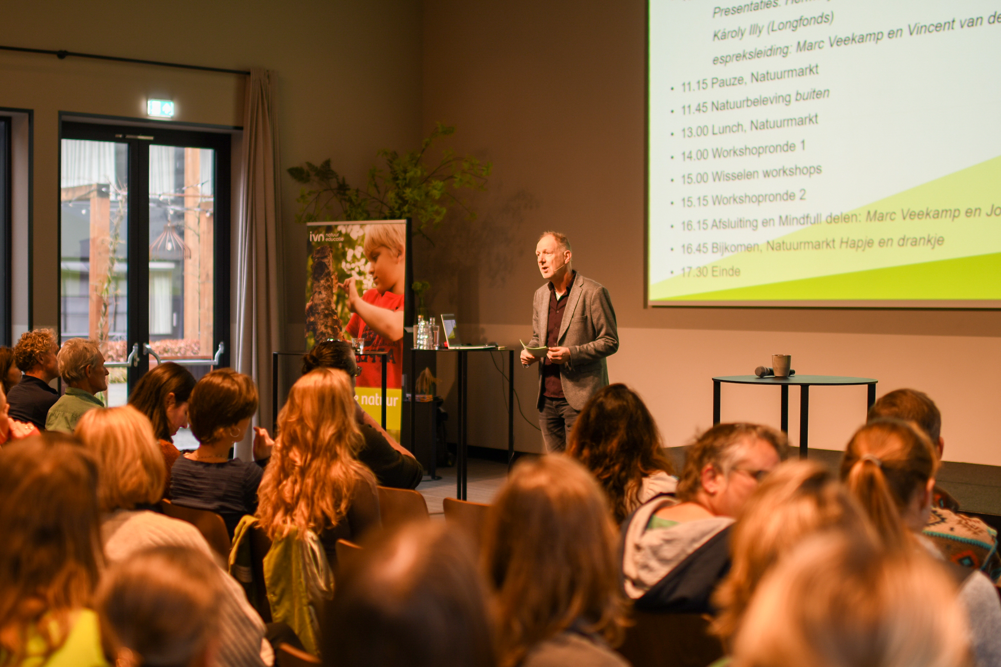 Met gesloten ogen en voeten stevig op de grond, wrijven we in onze handen. Zo horen we de wind. Kloppend op onze bovenbenen lijkt het net alsof het regent. Met ruim 200 deelnemers visualiseren we dat we een bos zijn. Onder leiding van Joris Verhees aarden we in een prachtig conferentiecentrum in de bossen van Lunteren. De Conferentie Kind en Natuur is van start.
