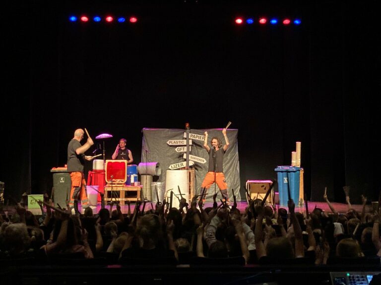 Na het openingswoord barstte het spektakel los en konden de leerlingen zich uitleven. Het podium van de Passagezaal van de Tamboer lag vol met ‘troep’ die door de vuilnismannen werd omgetoverd tot muziekinstrumenten. Ze drumden op alles wat ze tegenkwamen en creëerden de meest waanzinnige ritmes. De leerlingen mochten meedoen met oude emmers en stokken, en vulden de zaal met ritmische geluiden die zowel oorverdovend als ontzettend mooi waren. Tijdens de voorstelling kregen de kinderen spelenderwijs ook belangrijke informatie over zwerfafval. De voorstelling werd afgesloten met enkele vragen zoals “hoelang duurt het voordat een banaan in de buitenlucht verteert?”. Kortom, het was niet alleen leuk, maar ook heel leerzaam.