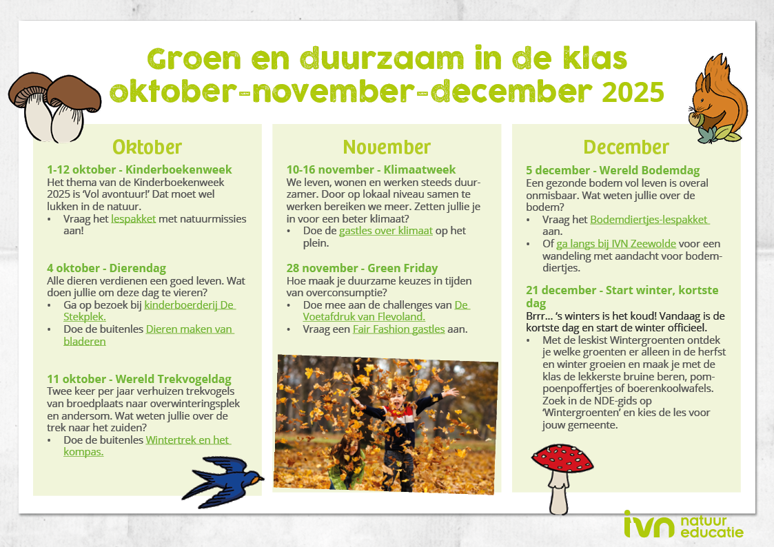 Altijd zicht op de leukste en belangrijkste themadagen op het gebied van natuur, milieu en duurzaamheid! Zo hoef je niets meer te missen en sluit je als school gemakkelijk aan bij de actualiteit. Ook bijpassende projecten, lespakketten en uitjes zijn direct binnen handbereik.