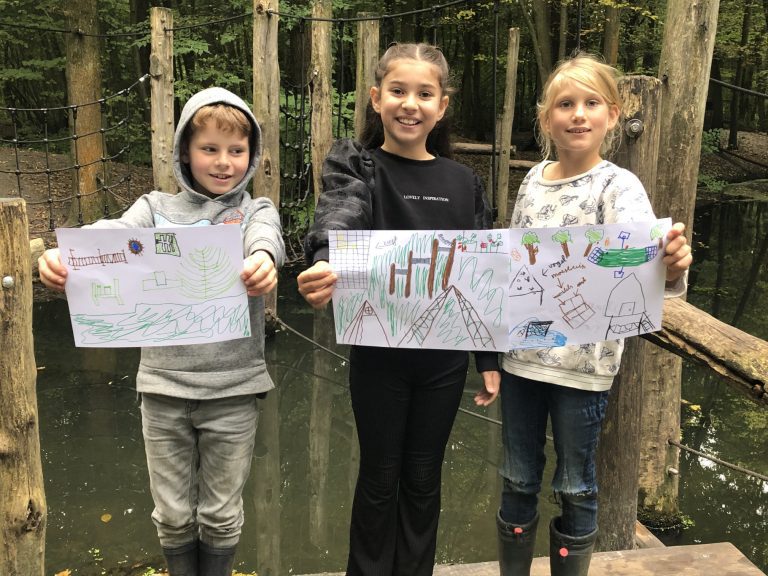 De foto’s van de groene schoolpleinen waren ook een mooie gesprekstarter om te kijken hoeveel groen er op het schoolplein te vinden was en wat de kinderen daarvan vinden. Een groen en gezond schoolplein voor ieder kind in Flevoland is iets waar we bij IVN Flevoland heel gelukkig van zouden worden. Ook de kinderdirecteuren staan hier achter. Zij vinden groene schoolpleinen belangrijk voor dieren en voor het klimaat. Een groen plein zorgt bijvoorbeeld voor minder wateroverlast op het schoolplein, en dáár hebben de kinderdirecteuren zelf wel eens last van. De kinderdirecteuren willen ook graag meer naar buiten tijdens de les. Bijvoorbeeld om te leren over de natuur en om lekker te kunnen bewegen. De kinderen hadden allemaal mooie ideeën om schoolpleinen te vergroenen en Het Belevenissenbos was ook een goede inspiratiebron. De kinderdirecteuren hebben hun ideale groene schoolplein vastgelegd in een tekening. Bekijk hieronder het resultaat: