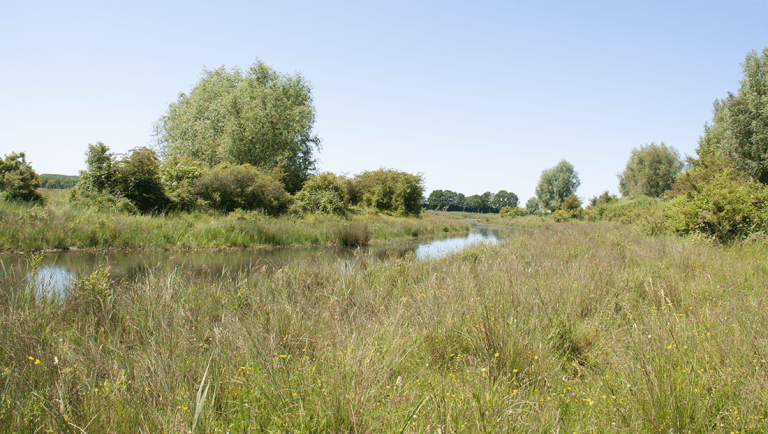 We vervolgen ons pad langs natuurgebied Kievitslanden. Een prachtig vochtig graslandgebied dat beheerd wordt met behulp van grote grazers. Een kudde koeien met kalfjes en een enorme stier komt nieuwsgierig op ons afgelopen. Gelukkig staat er een hek tussen ons in en blijven we elkaar van een afstandje bekijken. In het voorjaar staat het hier vol met pinksterbloemen en dotterbloemen. Een paradijs voor de kievit, graspieper en tureluur. En voor de weidebeekjuffer die vrolijk rondfladdert langs de oever van de Mosseltocht. Op dit soort stukjes komen we bijna geen mens tegen.