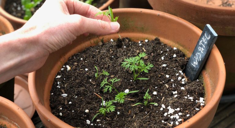Uitdunnen, hoe doe je dat? Kijk welk plantje er het grootst en sterkst uitziet. Dat plantje laat je staan. De ander plantjes eromheen trek je voorzichtig uit de grond.