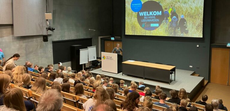 ‘In mei kwamen de hagelstenen door het toilet naar boven en stonden de straten blank’. Zo wordt de relevantie van dit project benadrukt tijdens de plenaire opening op de Hogeschool van Hall Larenstein in Leeuwarden op 20 september. Het auditorium zit tot de nok toe vol – 250 leerlingen uit Fryslân vullen de zaal. Maar het blijft niet bij luisteren, leren doe je door te doen. Daarom is er een grote variatie aan workshops georganiseerd, gegeven door experts op het gebied van water en klimaatbestendigheid.