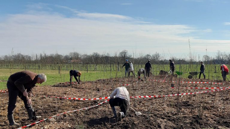 Op 20 maart plantten Kees en Karin met veertien vrijwilligers het bos van 300 m2 aan. Kees: ‘de sfeer zat er goed in en we boften met het weer.’ Van te voren had Kees samen met een vrijwilliger de 300 m2 onderverdeeld in elf vlakken van 20 tot 40 vierkante meter, zodat iedereen coronaproof op zijn eigen vlak kon planten. Drie uurtjes én een uitgebreide lunch later zaten alle boompjes erin. De komende dagen helpen cliënten mee om de laatste houtsnippers te verdelen. Daarna is het bosje klaar om te groeien.