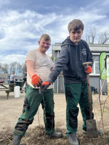 Op deze mooie, zonnige dag gaan de leerlingen enthousiast aan de slag met het planten van bomen en struiken. ‘Dit wordt mijn nieuwe favoriete plekje’, aldus één van de leerlingen.