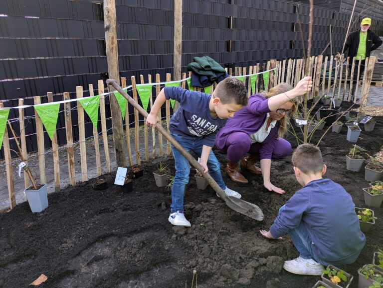 Tijdens de feestelijke plantdag staken 41 leerlingen uit twee groepen 3 enthousiast de handen uit de mouwen. Na een korte uitleg mochten ze de jonge planten in de grond zetten: van appel- en perenbomen tot colakruid en citroenmelisse. De kinderen gingen er fanatiek mee aan de slag. Tussen het planten door waren kreten te horen als: ‘Juf, ik heb er al twee geplant!’, ‘Hé, een stekelplant!’ en ‘is dat een braam? Lekker!’ De leerlingen zijn duidelijk enthousiast. Raf: ‘heel fijn, dat we hele gezonden dingen kunnen eten, groot worden en groeien’.
