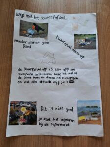 Daarom hebben zo’n 140 leerlingen van basis-kader oplossingen bedacht om zwerfafval in de gemeente te voorkomen. Ze kropen één dag in de rol van adviseur voor de gemeente West Betuwe. Om tot goede oplossingen te komen zijn de leerlingen op zwerfafvalexcursie geweest rond de school. Tijdens de zwerfafvalopruimactie kwamen de leerlingen veel verschillende soorten zwerfafval tegen. “Er lagen superveel sigarettenpeuken en heel veel snoeppapiertjes”, aldus een van de leerlingen. Terug in de klas werkten ze aan een concrete oplossing om ervoor te zorgen dat er minder afval op straat belandt.