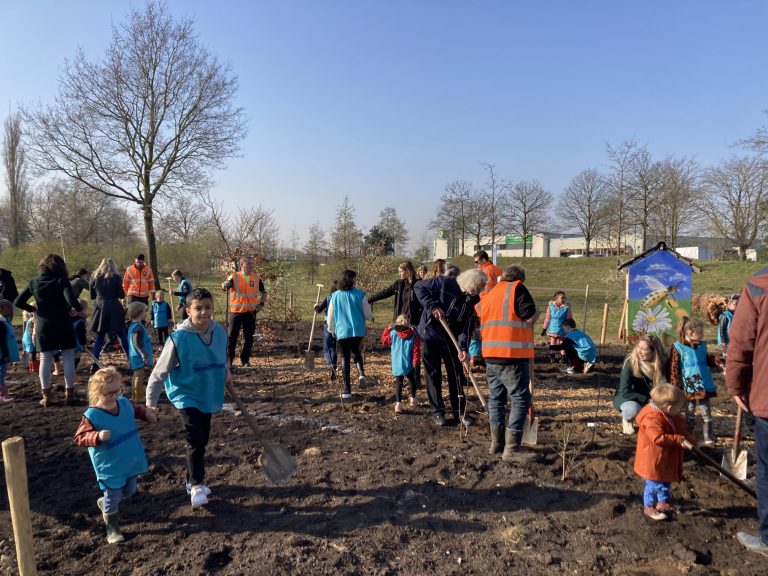 Na een korte natuurles van IVN Natuureducatie gingen circa 600 boompjes de grond in van 35 verschillende inheemse bomen- en struiksoorten op deze prachtige zonnige dag. De leerlingen van Aquamarijn zijn actief betrokken geweest bij het ontwerp van het nieuwe minibos. Het is een speels ontwerp geworden met paden, wilgenbogen, een klimboom, insectenhotel en een buitenlokaal.