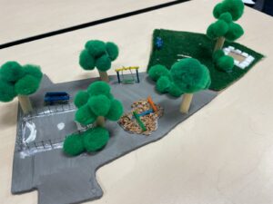 De overeenkomst tussen de maquettes is het vele groen, maar voetbalveldjes en schommels zijn eveneens een populaire keuze. Naast bomen passeren ook kleurrijke bloemen, groene, schaduwrijke tunnels en kassen de revue. “Bomen en groen zijn belangrijk om CO2 op te nemen”, vertellen Ben, Dies en Julius. Ze hebben ook zonnepanelen toegevoegd aan hun plein om groene energie op te wekken.