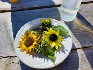 De lunch werd bereid door de werkgroep ‘Eten uit de Natuur’ met zojuist verzamelde kruiden zoals hondsdraf, zevenblad, brandnetel en paardenbloemblad. Naast de gerechten konden de vrijwilligers ook genieten van de stralende zon tijdens het eten.