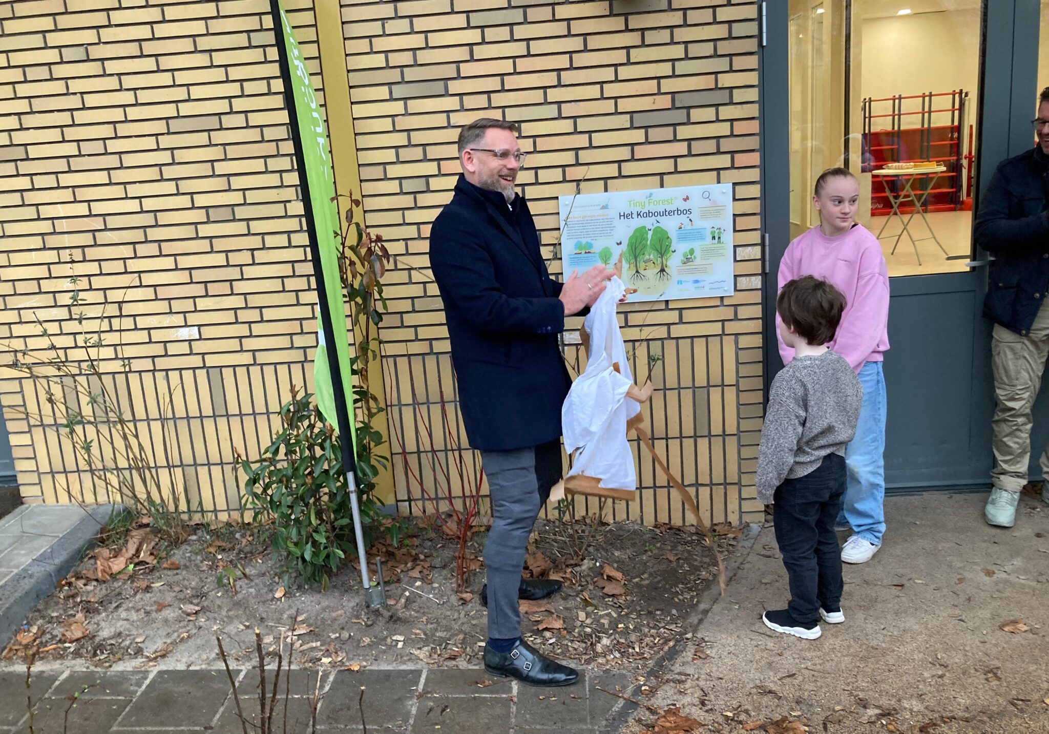 Wethouder Stefan van Keijzerswaard van gemeente Het Hogeland onthulde het informatiebord samen met de jongste én oudste leerling van de school, onder het toeziend oog van Mathijs ter Bork, regiodirecteur Noord bij IVN Natuureducatie. De school koos zelf de naam die op het bord kwam te staan: Het Kabouterbos. En daarmee werd het écht hun bosje.