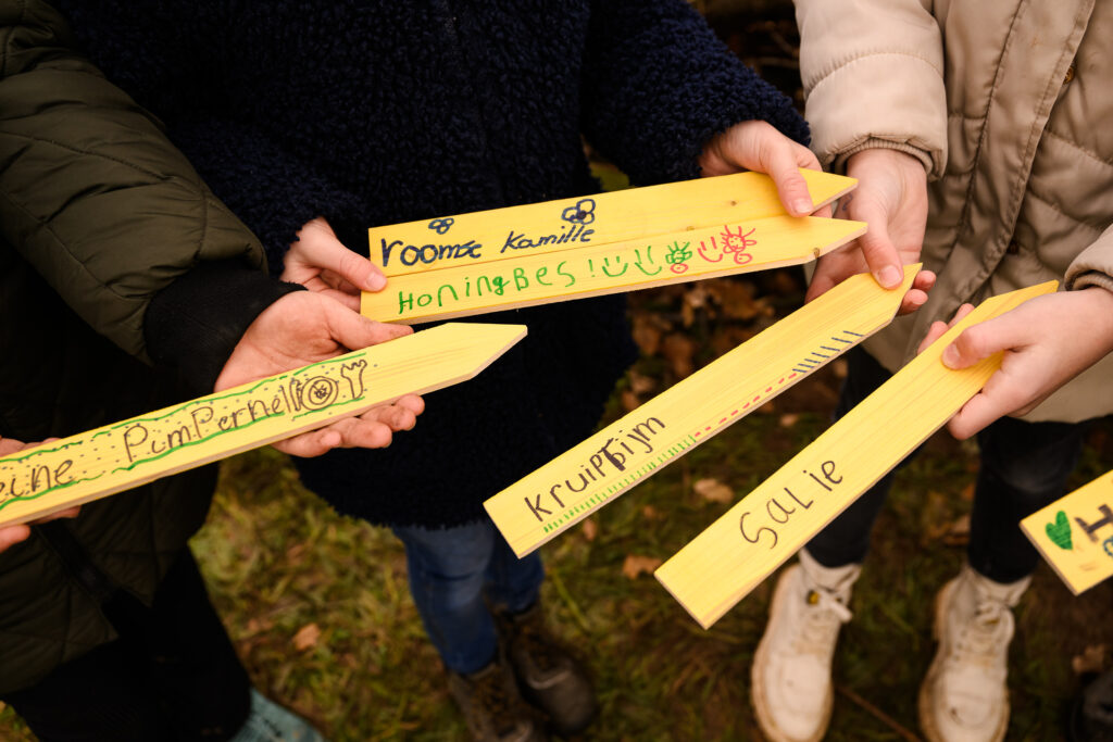 Ook de plantenstekers worden meteen gemaakt en in de grond gezet bij de juiste planten. De leerlingen schrijven zelf de namen op en versieren de plantenstekers met de mooiste kunstwerken. ‘Kijk, hier staat de lavendel.’
