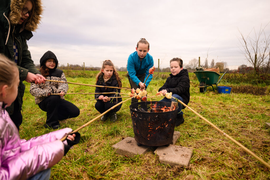 De leerlingen lijken de kou nauwelijks te voelen en als ze toch koude handen krijgen, kunnen ze opwarmen en appels roosteren bij de vuurkorven. ‘Mmmm, het smaakt naar appelflap.’