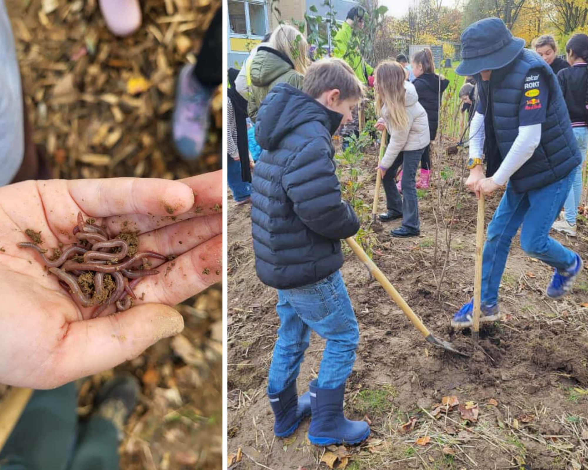Wanneer een regenworm tevoorschijn komt, leggen Daniek en Tim uit dat ze die bij de wortels mogen leggen. Tim: ‘wormen eten organisch materiaal wat uiteindelijk weer mest wordt. Daar kan je boom weer van eten.’