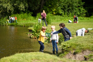 De lucht was strak blauw, de grond drassig en de vogels vloten honderduit. Bij het pierenbadje ging de buitenles van start. De boswachter warmde de kinderen op met een dansje. Daarna verspreidden de groepen zich. Ze kregen les in het bos, langs het water en op de grasvelden. Kinderen leerden spelenderwijs over de natuur door opdrachten, spelletjes en activiteiten. Ze bouwden hutten, gingen op zoek naar planten en dieren en stampten met hun laarzen door de modder.