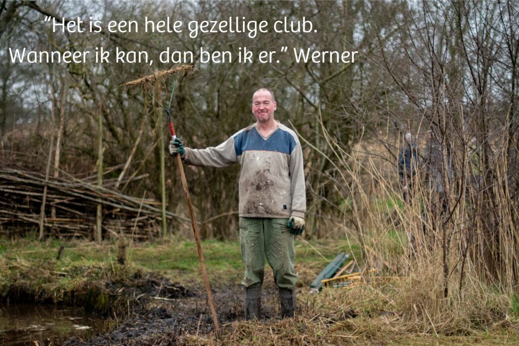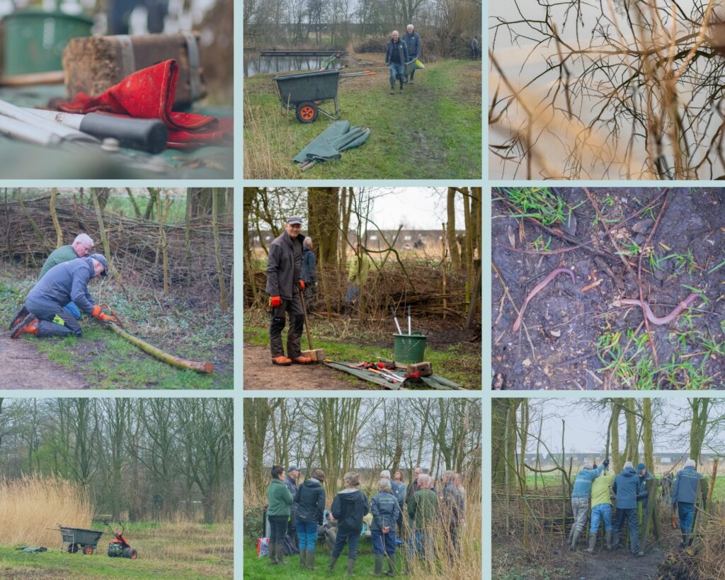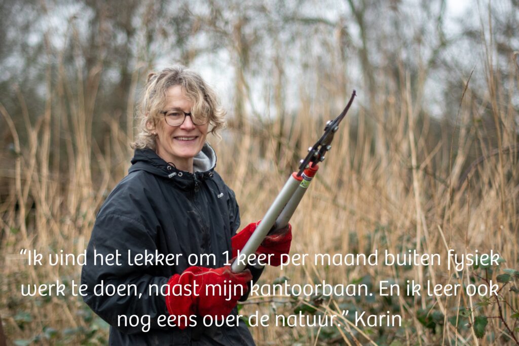Vandaag staan verschillende klussen op het programma, waaronder het versterken van de takkenril. Er wordt hard gewerkt, maar er worden ook grappen gemaakt, de sfeer zit er goed in. Een stel met een hond loopt voorbij. “Mooi hè, schat, zo’n takkenhaag?” Vrijwilliger Karin blijft achter om de bramenstruiken te lijf te gaan. “Ik vind het lekker om 1 keer per maand buiten fysiek werk te doen, naast mijn kantoorbaan. En ik leer ook nog eens over de natuur.”