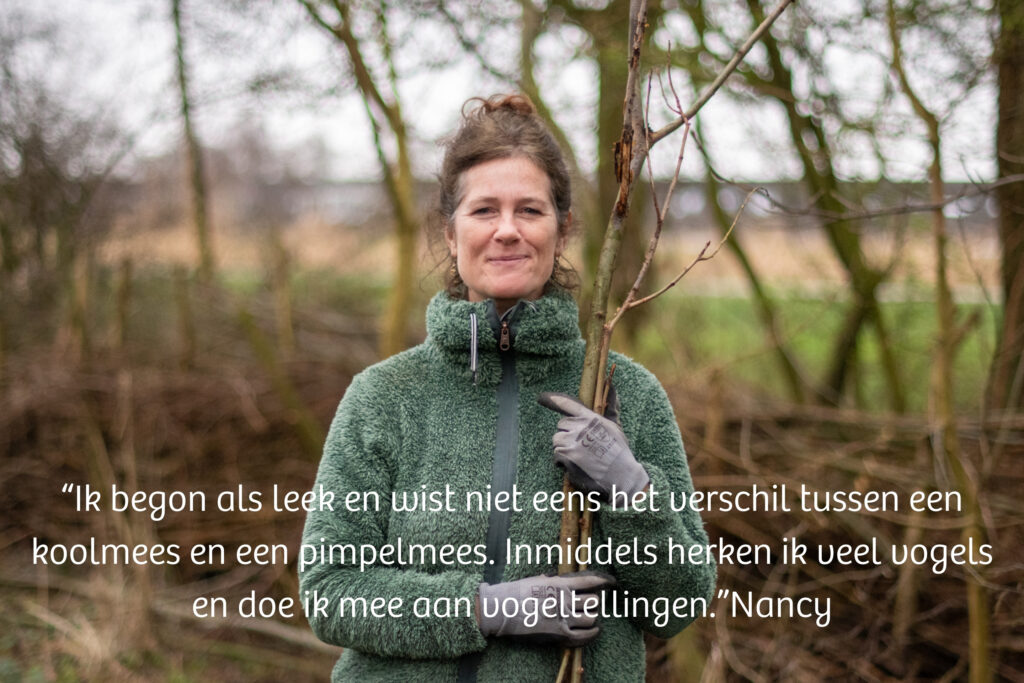Nancy werkt al sinds 2015 in de Heemtuin. “Ik vind het heerlijk om buiten te werken. Ik heb me toegelegd op vogels. Ik begon als leek en wist niet eens het verschil tussen een koolmees en een pimpelmees. Als je buiten werkt, gaat het leren spelenderwijs. Inmiddels herken ik veel vogels en doe ik mee aan vogeltellingen. Ik nam de natuur altijd als vanzelfsprekend. Nu denk ik er meer over na en ben ik me meer bewust van bepaalde keuzes. Ik ben heel blij dat de gemeente nu ook ecologen in dienst heeft. Zij hebben er goed zicht op.”