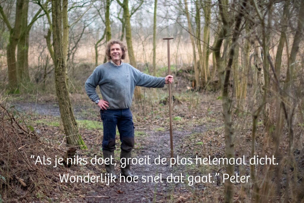 Ik blijf nog even staan praten met Louis. “Als klein Amsterdams jongetje ging ik bij de Nieuwe Meer met mijn broer de natuur in. Hij wist een nest met 20 ransuilen te vinden in een tuin van het volkstuinencomplex. Zo indrukwekkend. De eigenaresse van de tuin kwam naar buiten gesneld. ‘Wat zijn jullie aan het doen, jongens?’ Ze had er totaal geen erg in dat er een nest in haar tuin zat. Toen is mijn liefde voor de natuur aangewakkerd. In ’91 werd ik lid van IVN. Ik ging op excursie naar deze heemtuin en ben nooit meer weg gegaan. Nu ben ik coördinator van deze groep en ook van de moerasgroep. Ook geef ik workshops over natuurbeheer en het gebruik van gereedschap.”