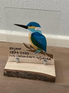 En er viel meer te vieren! IVN Hellendoorn-Nijverdal bestaat dit jaar 50 jaar evenals IVN Deventer en IVN Zwolle. IVN Olst-Wijhe en IVN Rijssen-Enter zelf 60 jaar! Hiervoor mochten de afdelingen een prachtig ijsvogelbeeld in ontvangst genomen. Gemaakt door één van de IVN vrijwilligers, kwam dit beeldje weer thuis. “Deze krijgt zeker een mooi plekje.”