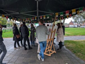Op woensdagavond 9 oktober stroomde de regen maar door. Toch weerhield dat de kinderen en volwassenen uit de Glanerbrug (gem. Enschede) er niet van om het nieuwe ontwerp voor hun nieuwe groene speel- en ontmoetingsplek te bewonderen. Dit is een project van Gezonde Buurten.