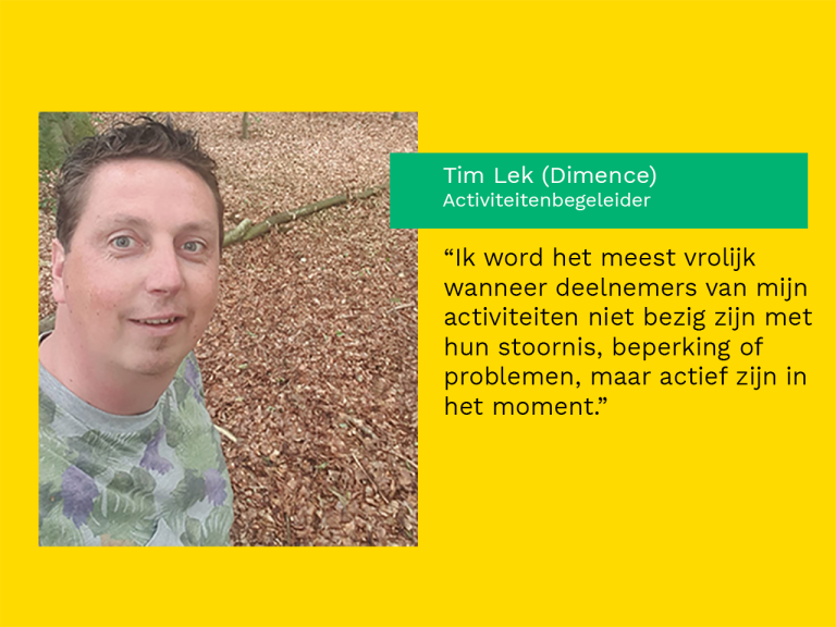 Tim Lek is al negen jaar activiteitenbegeleider bij Dimence in Deventer. Hij zorgt samen met zijn collega’s voor een zeer gevarieerd aanbod voor klinische patiënten binnen het Specialistisch Centrum Ontwikkelingsstoornissen (SCOS). Tim: ‘Ik word het meest vrolijk wanneer deelnemers van mijn activiteiten niet bezig zijn met hun stoornis, beperking of problemen, maar actief zijn in het moment.’ We stelden Tim vijf vragen over de rol van natuur binnen de organisatie.