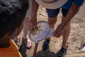 Met onderwaterkijkers, schepnetjes, verrekijkers en glazen bakken leerden ze over wieren, kwallen, krabben en andere waterdiertjes. Bij één van de posten haalde een vrijwilliger van NME een grote krab uit het schepnet, draaide hem om en legde uit: “Aan de vorm van het buikschild kun je zien of het een mannetje of vrouwtje is.” Even later durfden de meeste kinderen het zelf ook aan. Daarna renden de krabben snel zijwaarts terug het water in.