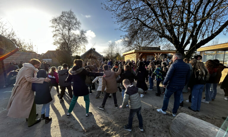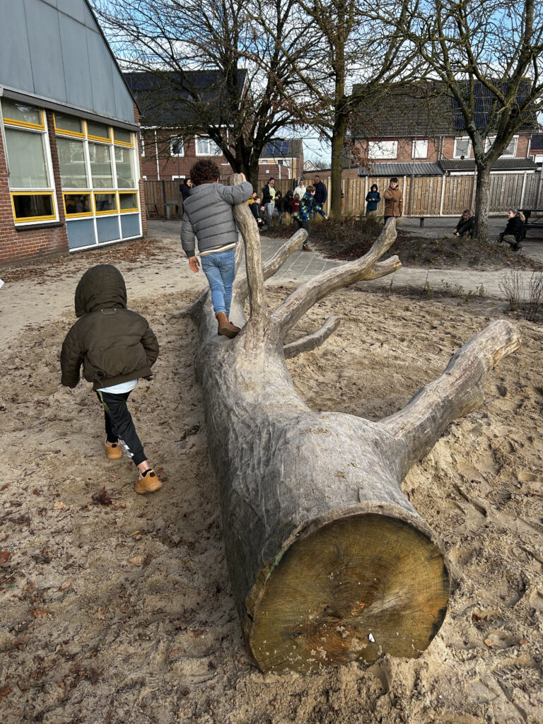De leerlingen zijn blij met het vernieuwde schoolplein. June uit groep 4 speelt tikkertje op de klimboomstam. “Je mag de grond niet aanraken!” vertelt ze er enthousiast bij. Intussen wil Sem uit groep 6 vooral voetballen en gebruikt hij diezelfde boomstam ook hierbij. “We proberen de bal over de boomstam naar elkaar te schieten.” Voor de oudere leerlingen is het schoolplein ook een fijnere plek geworden. “Eerst was het meer open en leeg. Het is nu al mooier met de planten en straks in de lente helemaal met alle bloemen. Echt spelen zoals de jongere kinderen doe ik niet meer, maar er zijn op het nieuwe schoolplein wel genoeg plekken waar ik met mijn vriendinnen kan chillen,” aldus Arwen uit groep 8.