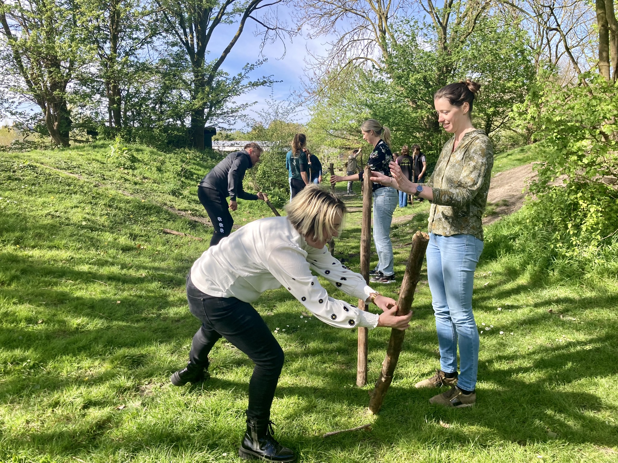 ‘Pak een tak en houdt die aan twee kanten vast’ roept Roos, trainer bij NatuurlijkSportief. In Natuurspeeltuin Hoogerzaal zette Roos alle leerkrachten met veel plezier in beweging. Ze liet zien dat je oneindig veel spellen kunt bedenken met simpele middelen, zoals een tak of een bankje. Allerlei insteken zijn mogelijk om kinderen op een leuke manier in beweging te krijgen. ‘Het vraagt even een andere manier van kijken naar materialen en wat je ermee kunt doen, maar als je het eenmaal te pakken hebt kun je met een stok wel honderd spellen verzinnen.’ vult Roos aan.