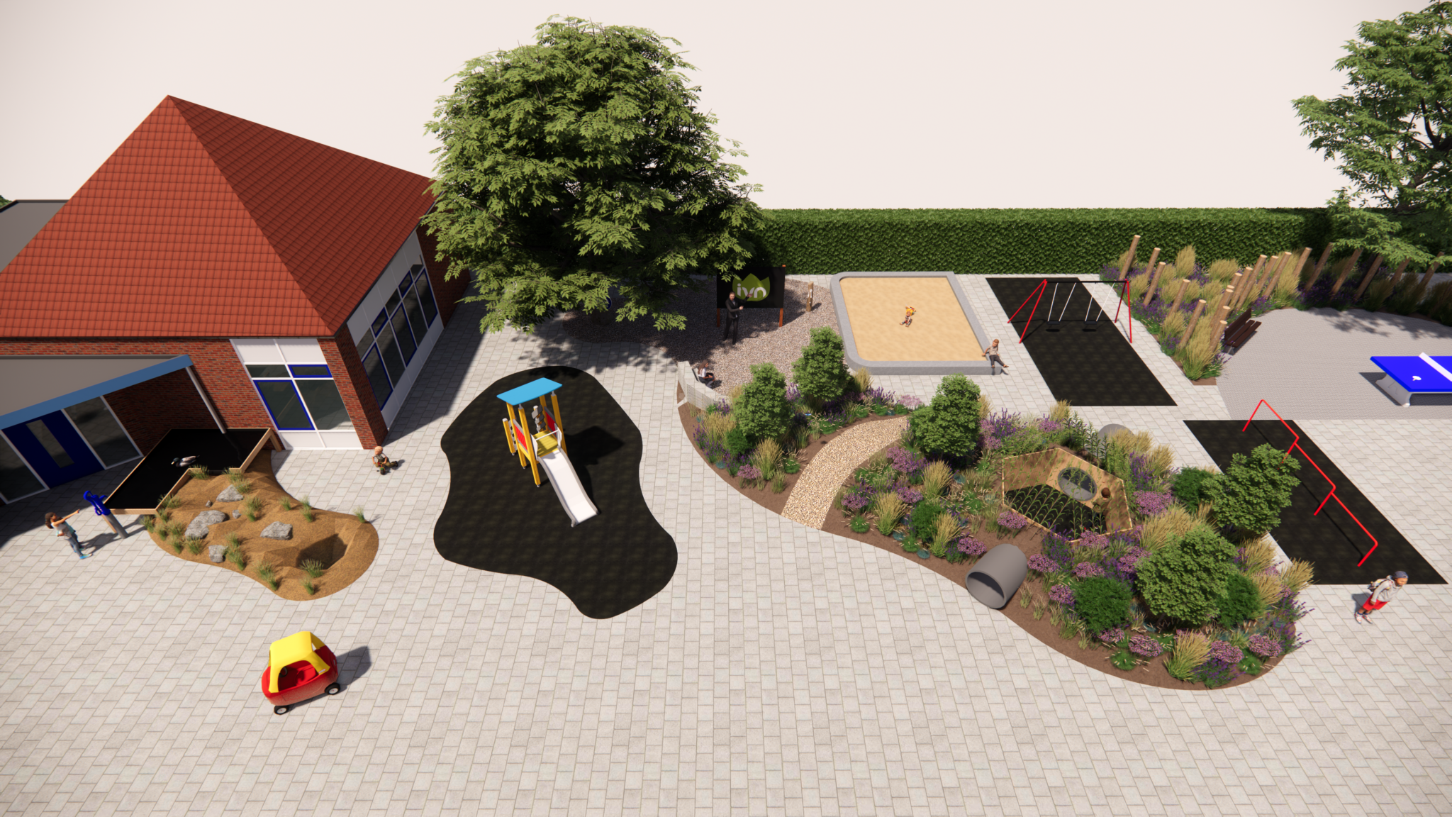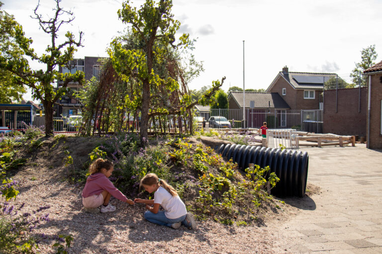 Basisschool de Vliete in Wissenkerke vond het hoog tijd voor de vergroening van hun schoolplein. Het achterplein was al prachtig groen, met een schooltuin, klimheuvel en kippen. Het voorplein kon nog wel wat extra vergroening gebruiken. De grijze tegels maakten dan ook plaats voor natuurlijke speelmogelijkheden én nog meer bomen.