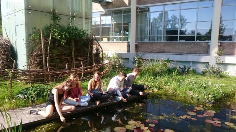 Ondertussen stroomt de tuin vol met leerlingen. Joris vertelt me dat ze bezig zijn met een opdracht die met ecologie te maken heeft. De tuin is ingericht volgens de verschillende stadia van successie. Van kleine kruiden tot bomen, alles is er te vinden. Indrukwekkend! Het valt op hoe rustig en vertrouwd de leerlingen met de tuin omgaan, ze genieten zichtbaar. “Veel leerlingen hebben aan de tuin meegewerkt, het proces gezien. Ze zijn erachter gekomen dat het heel relaxed is om in de natuur te zitten. Sommige studenten komen hier echt even op adem, dat is toch mooi om te zien?”