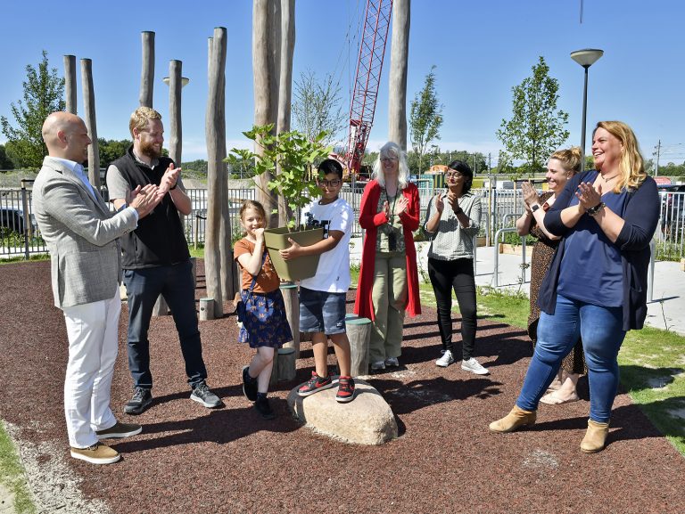 Om de samenwerking te vieren overhandigden wethouder van de Laar en Dylan Haanappel (IVN Natuureducatie) symbolisch de eerste boom voor het Tiny Forest in Parkrijk aan Anneloes van der Graaff (IKC Parkrijk) én de Rijswijkse Kinderrechtenambassadeurs Arda en Niloufer. De boom krijgt een (tijdelijk) plekje in de schooltuin. “Met een beetje geluk kunnen we de boom over 1,5 jaar daadwerkelijk planten in het Tiny Forest. Ik ben blij dat IKC Parkrijk deelneemt aan dit project. De kracht van een Tiny Forest is dat het buurtbewoners, jong én oud, dichter bij elkaar brengt. En dat het mens en natuur met elkaar verbindt. Daarom gaan we naast de school ook (toekomstig) buurtbewoners van Parkrijk betrekken bij het Tiny Forest”, aldus wethouder Van de Laar.