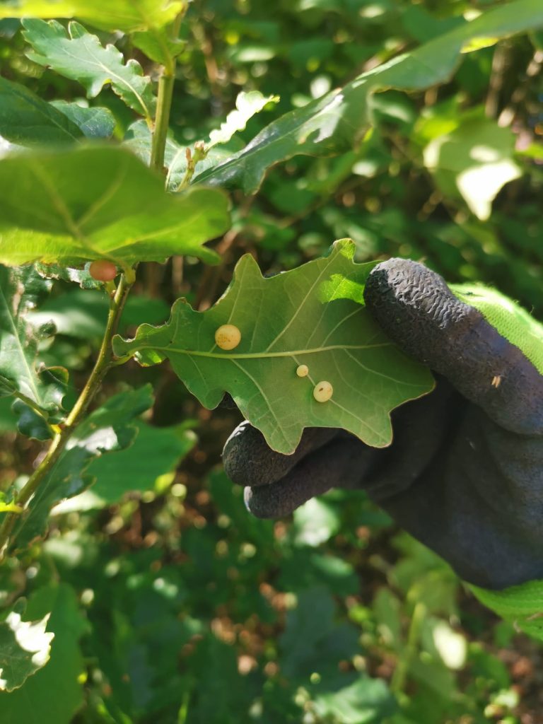 We hebben opnieuw ontzettend veel brandnetels en klimplanten weggehaald, het pad weer netjes vrijgemaakt en de laaghangende takken gesnoeid. Tijdens het werk kwamen we veel insecten tegen, zoals bladluizen (lekker voor de lieveheersbeestjes!) en de bolletjes van de galwesp onder eikenblaadjes.